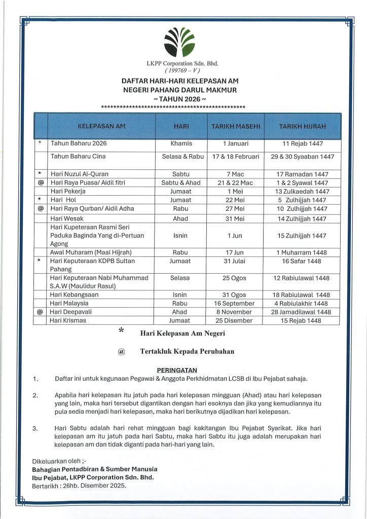 NOTIS PEMBERITAHUAN TIADA NOTIS PADA MASA INI. DAFTAR HARI-HARI KELEPASAN AMNEGERI PAHANG DARUL MAKMURTAHUN 2026 Facebook SENARAI KLINIK PANELIBU PEJABAT